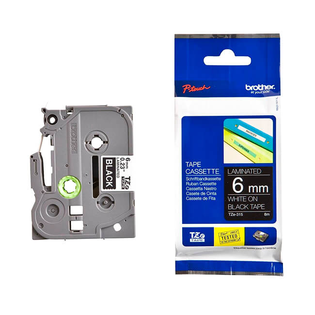 CINTA BROTHER TZE-315 LETRA BLANCA SOBRE FONDO NEGRO 6MM (1/4″) X 8 MTS TZE315